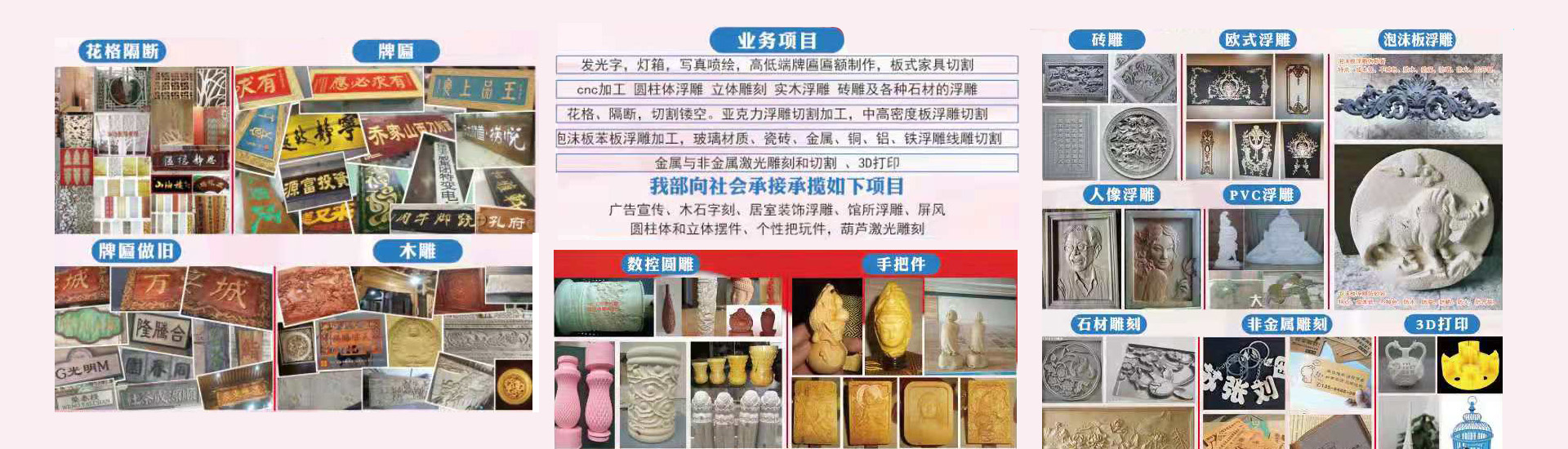 迷你发光字,各种灯箱,非金属激光加工,高低端牌匾匾额制作,cnc加工 石材 雕刻 圆柱体浮雕 立体雕刻 实木浮雕 花岗岩大理石及各种石材的浮雕加工,实木浮雕,硬木浮雕,亚克力浮雕切割加工,中高密度板浮雕切割加工,泡沫板苯板浮雕加工,玻璃材质、瓷砖、 金属、铜、铝、铁浮雕线雕雕刻加工。 我部向社会承接承揽如下项目:木石字刻、居室装饰浮雕、馆所浮雕、屏风、圆柱体和立体摆件、个性把玩件,葫芦激光雕刻。电话0312-2132913 13663323981